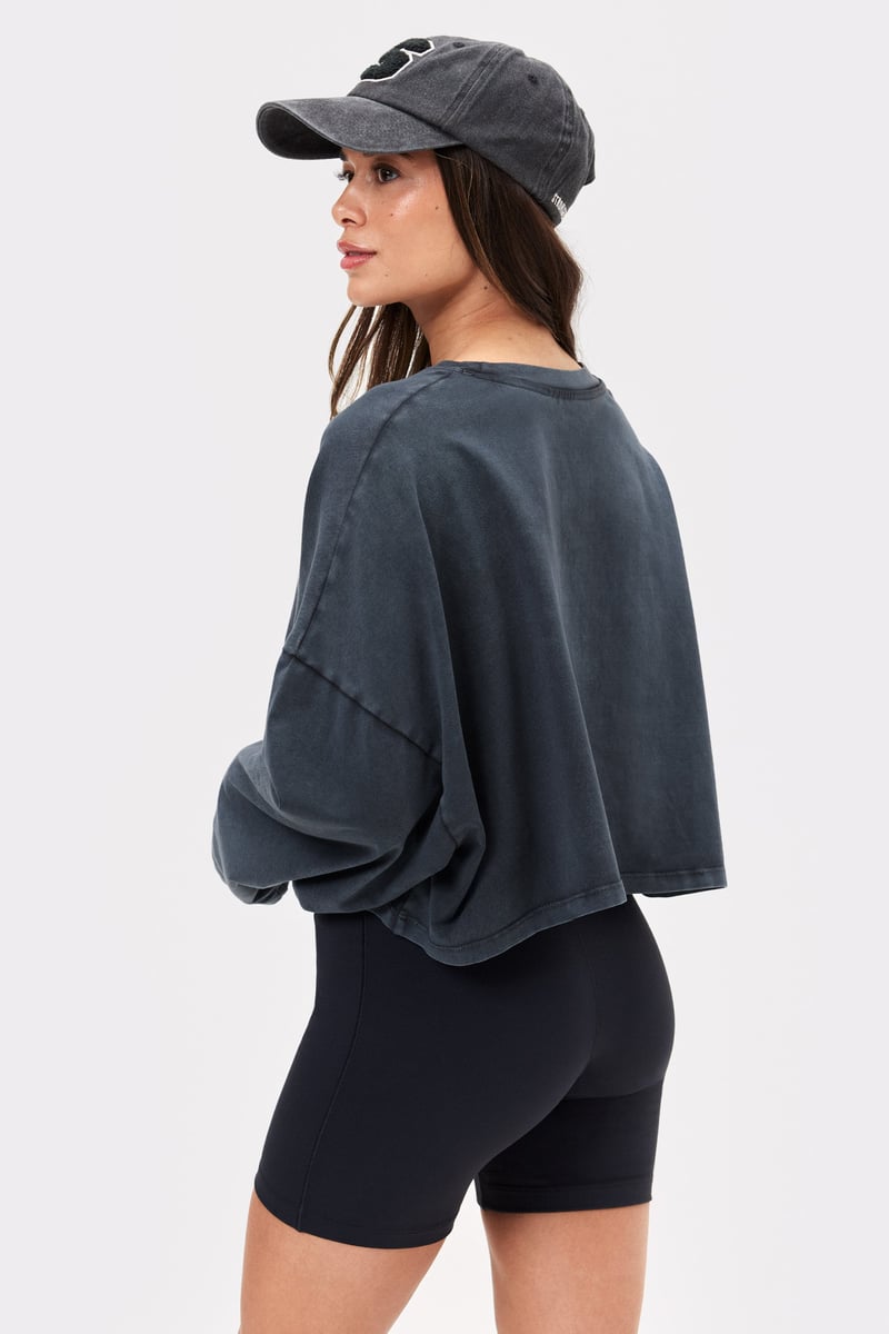 The Washed Cropped Long Sleeve in Black combines comfort with a trendy washed-out look that adds character to your outfit. This cropped top offers a breathable and comfortable feel against your skin. The oversized fit creates a relaxed silhouette that's perfect for both workouts and everyday wear.