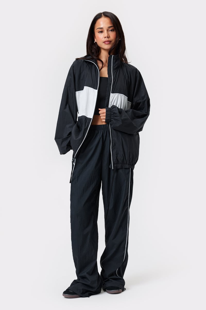 Our black Woven Pants have an oversized fit and straight legs - perfectly over your outfit to & from your workouts or for everyday activities. These retro-inspired pants are designed with white piping details, pockets, and an embroidered stronger logotype on the leg.