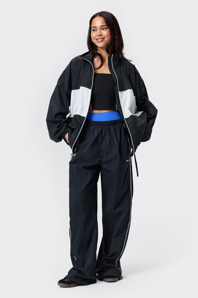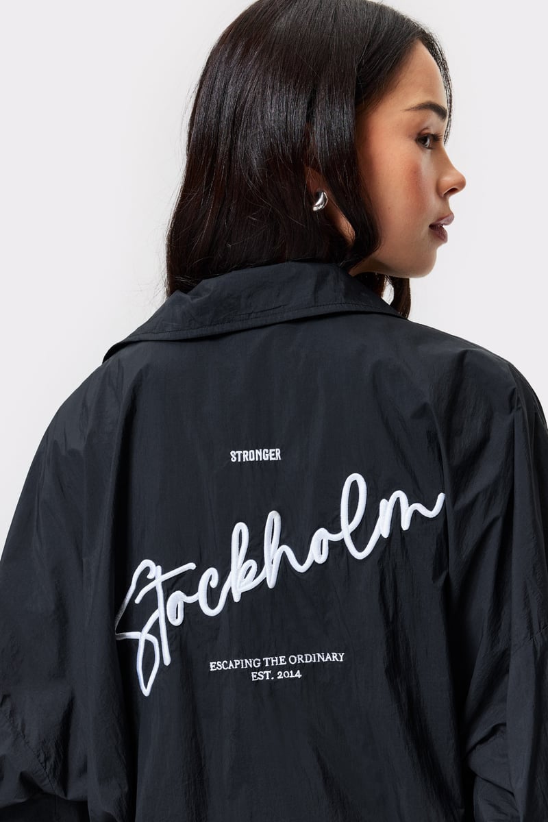 Our black Woven Jacket has an oversized fit that goes perfectly over your outfit to & from your workouts or everyday activities. It is designed with dropped shoulders, a high collar, and a alrge Stockholm embroidery at the back. This 80s-inspired jacket also has pockets and a drawstring at the bottom for an adjustable fit.