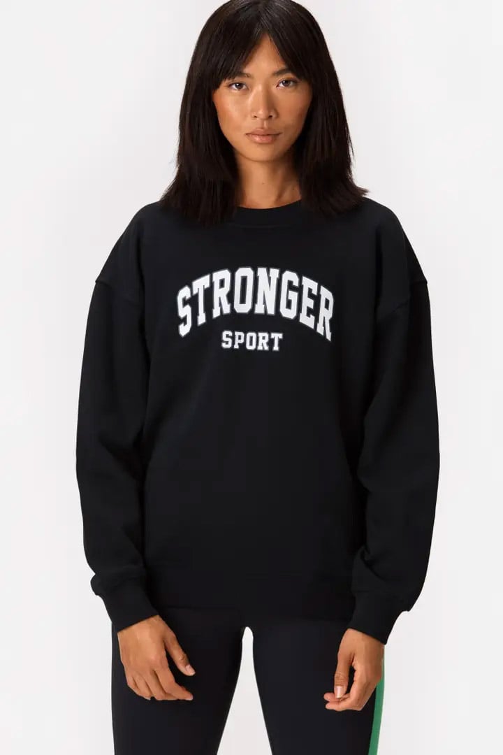 Comfy Sweatshirt has a loose fit with a soft, brushed inside. The black sweatshirt is designed with a crewneck, ribbed cuffs and a STRONGER logo in varsity-style. This college-inspired sweater is the ultimate throw-on piece that elevates any sporty look.