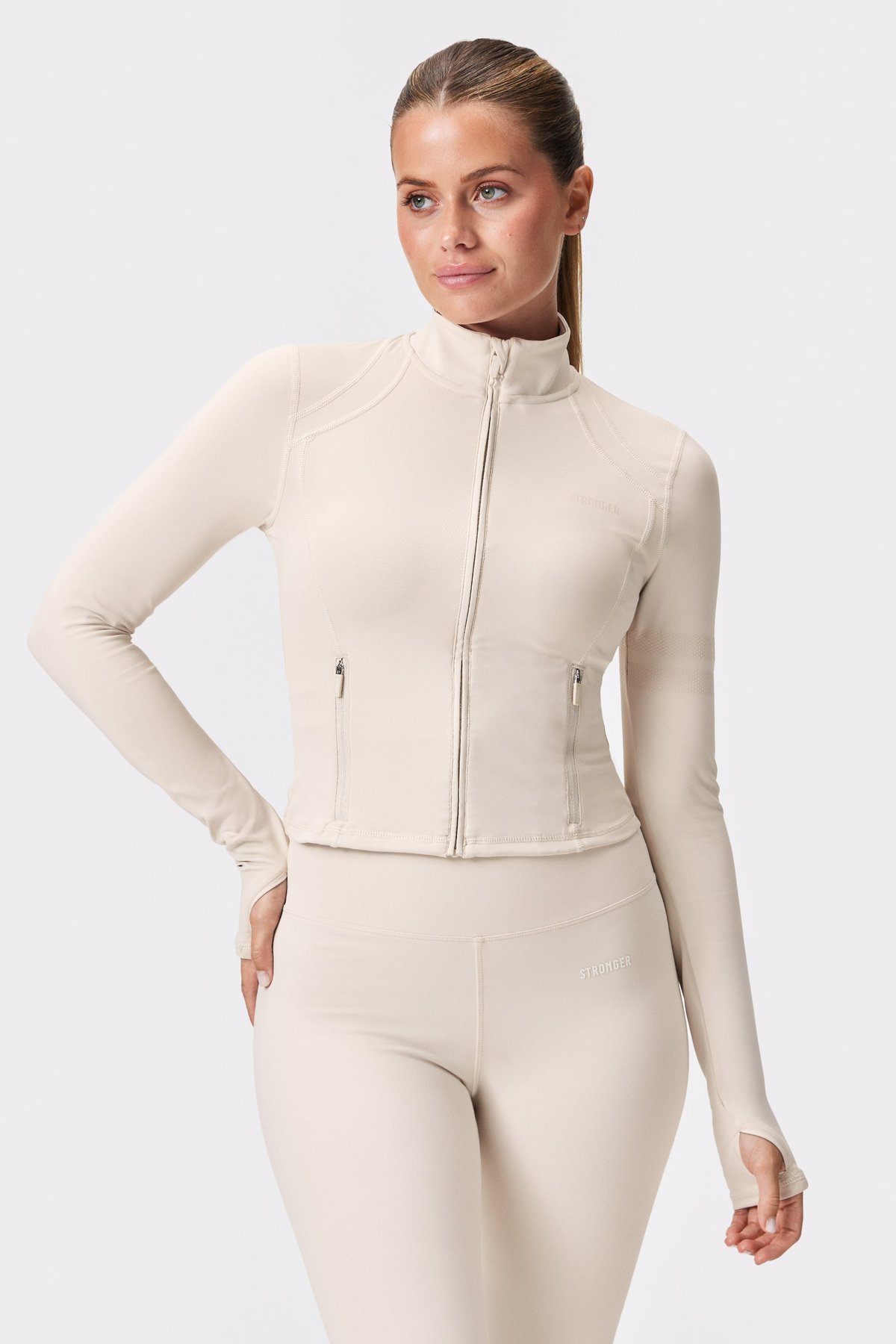 Onze Figure Zip Jacket is een stijlvolle zwarte jas voor wie op zoek is naar een stijlvolle look met een slanke pasvorm. Het materiaal is zweetafvoerend, sneldrogend en zeer ademend. Het heeft een verborgen ritssluiting, zakken met ritssluiting en duimgaten. De jas is afgewerkt met glanzende bedrukte details. Perfect om over sportkleding of een casual outfit te dragen.